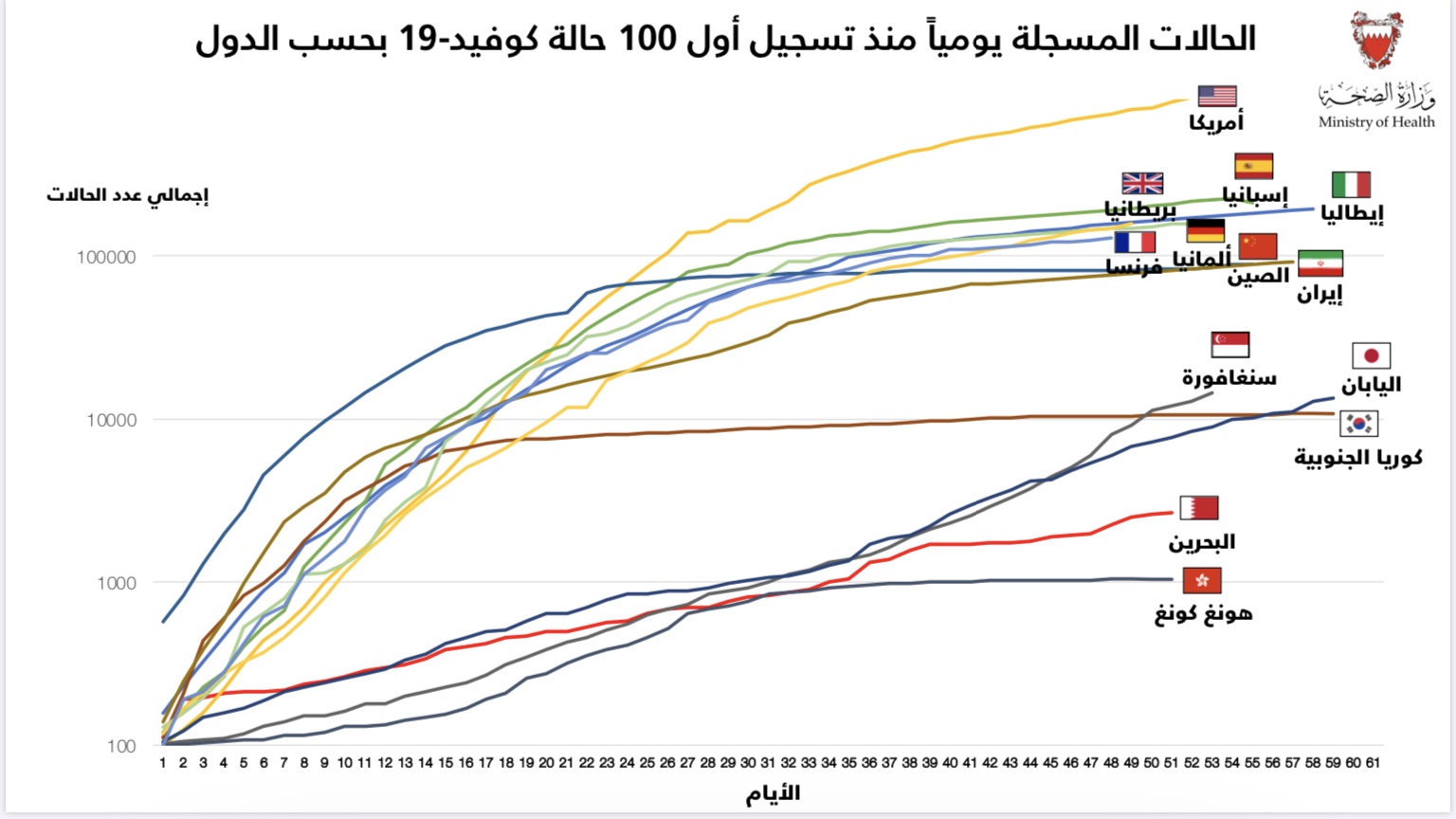 الحالات المسجلة يومياً منذ تسجيل أول 100 حالة كوفيد-19 بحسب الدول