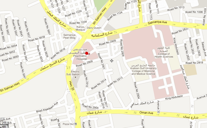 كما هو موضح أعلاه في الخارطة يقع مستشفى الطب النفسي في محافظة العاصمة من مملكة البحرين في منطقة السلمانية، بالقرب من مجمع السلمانية الطبي ( من الجهة الأمامية)، و يحده شمالاً شارع السلمانية (الحديقة المائية وديري كوين)، كما يحده من الخلف شارع الشيخ سلمان (لاميزون دي كافيه)، ويميناً يحده شارع رقم 2909 .